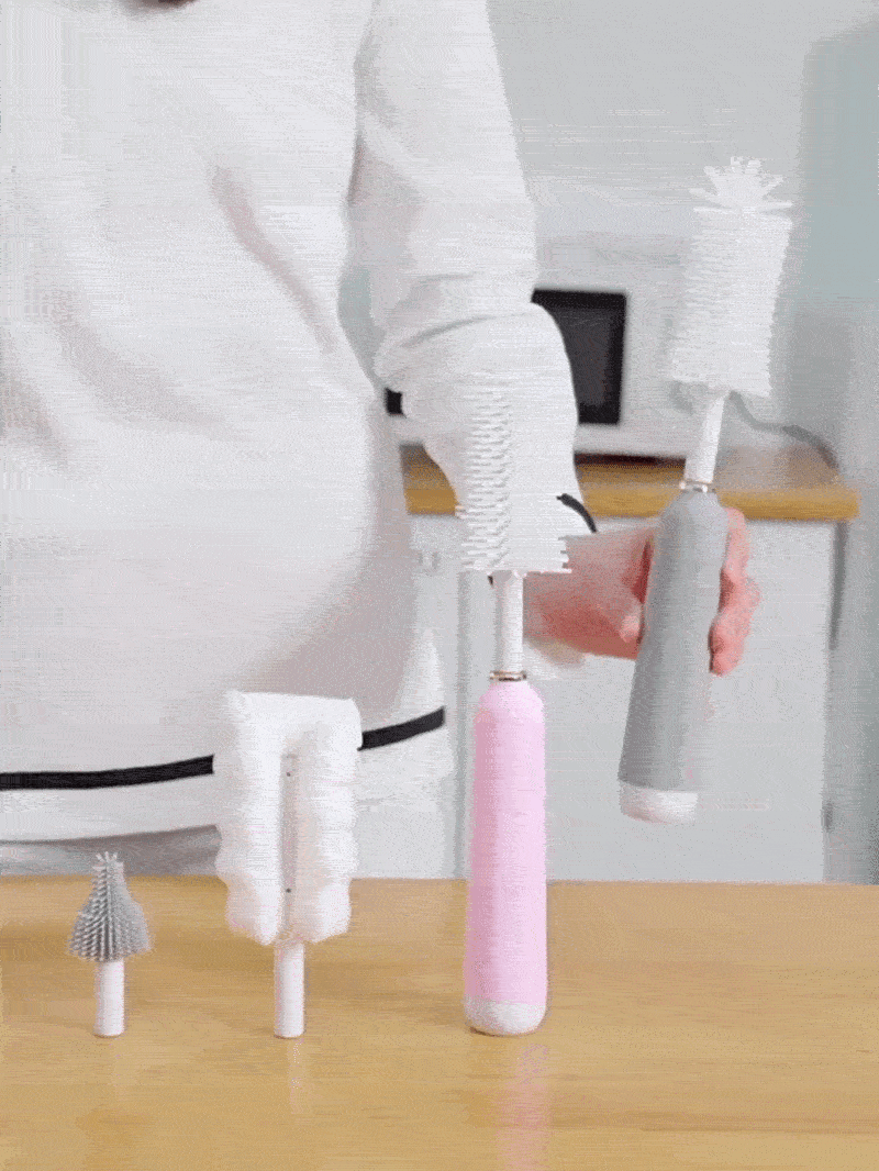 Końcówki wykonane są z miękkiego silikonu, który delikatnie czyści powierzchnię butelki, nie rysując jej. To bezpieczniejsza opcja niż twarde włosie czy szorstkie gąbki, które z czasem matowią plastik i szkło.